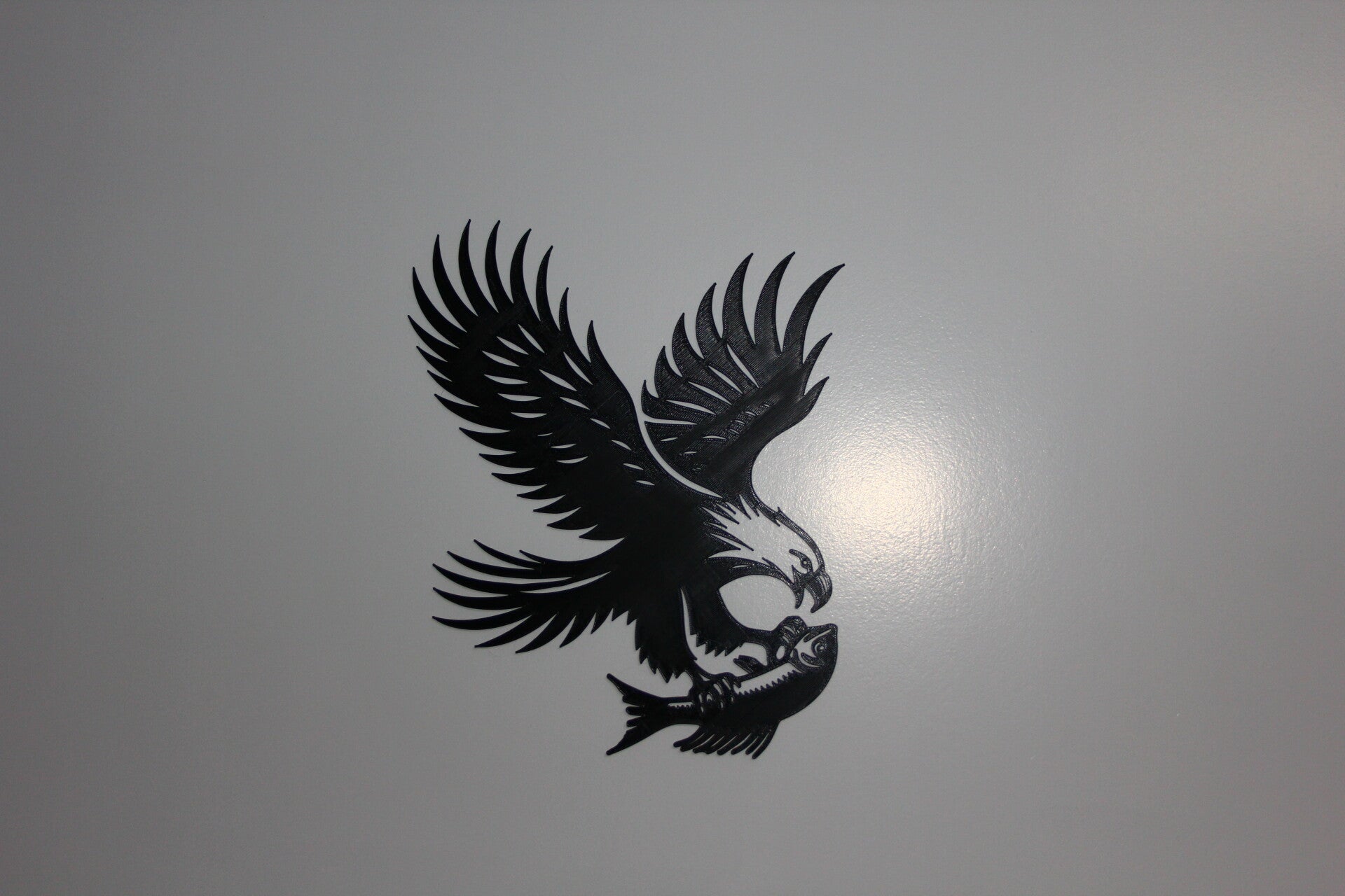 Krachtige 3D-geprinte wall art van een roofvogel met een vis in zijn klauwen, een echte blikvanger voor aan de muur.